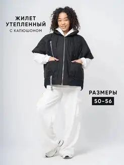 Жилетка оверсайз утепленная безрукавка с капюшоном черная