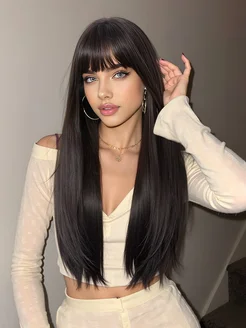 парик длинный с челкой черный шатенка