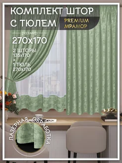Шторы мрамор на кухню с тюлем короткие 270х170 см
