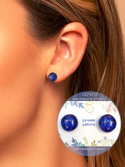 Синие серьги-гвоздики пусеты из ювелирного стекла