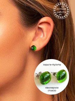 Зеленые серьги-гвоздики пусеты из ювелирного стекла