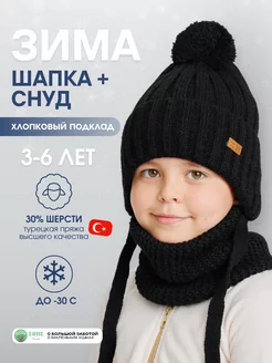 Комплект из вязаного снуда и шапки с бумбоном и завязками