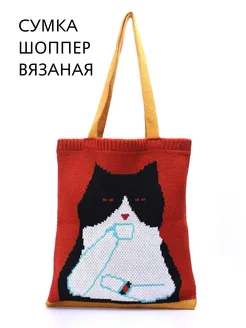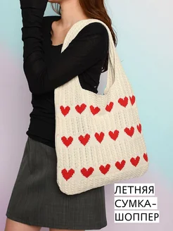 Сумка-шоппер на плечо вязаная пляжная большая с сердечками