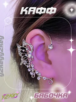 Серьги женские бижутерия кафф без прокола бабочка с камнями