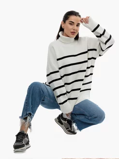 Свитер в полоску с горлом оверсайз вязаный зимний