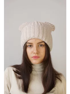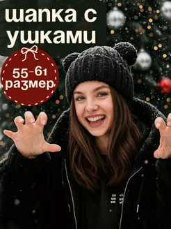 Шапка вязаная с ушками мишки с флисом зимняя теплая