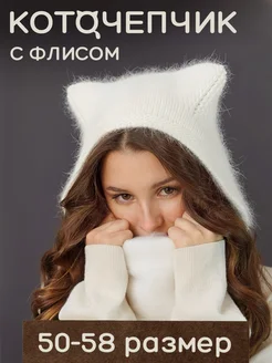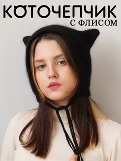 Шапка y2k чепчик на завязках с ушками кошки пушистый зима