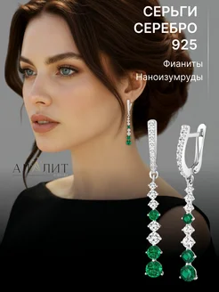 Серьги серебро 925 пробы с изумрудами и фианитами висячие