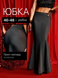 Атласная праздничная юбка рыбка годе черный леопард длинная