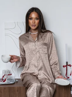 Пижама шелковая со штанами и рубашкой домашняя новогодняя