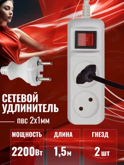 Удлинитель сетевой 2 розетки 1,5 метра с выкл. ПВС 2х1