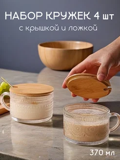 Набор стеклянных кружек с бамбуковой крышкой и ложкой, 4 шт