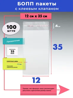 Упаковочные бопп пакеты 12х35 см с клеевым клапаном 100 шт