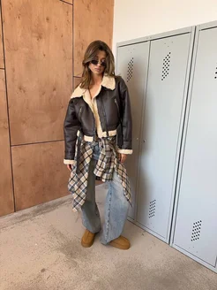 Дубленка оверсайз коричневая зимняя