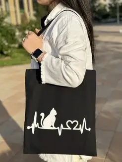 Сумка шоппер черный с принтом кошка и сердце