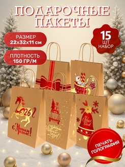 Пакеты новогодние для подарков крафт с ручками 15 шт