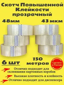 Скотч широкий прозрачный 150 метров 6 штук 48 мм 43 мкм
