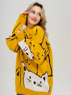 Свитер женский оверсайз удлиненный с кошками вязаный