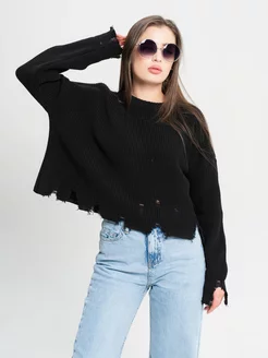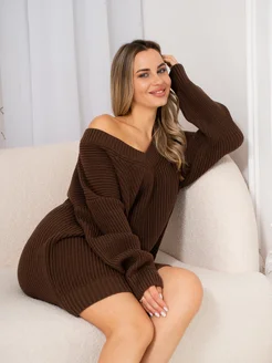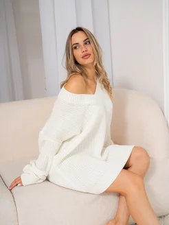 Свитер оверсайз удлиненный пуловер с вырезом теплый вязаный