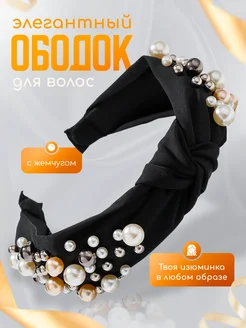 Ободок для волос широкий черный тканевый с жемчугом