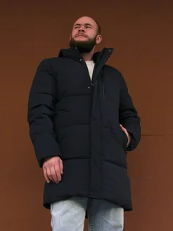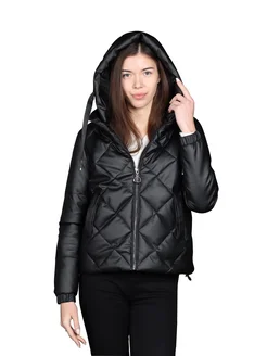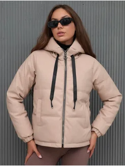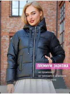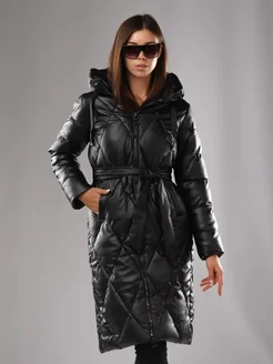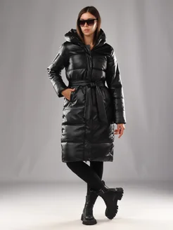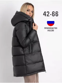 Куртка удлиненная с капюшоном зимняя из экокожи