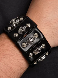Браслет-напульсник широкий кожаный с шипами и черепами
