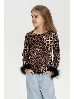 Кофта нарядная с перьями на рукаве с леопардовым принтом