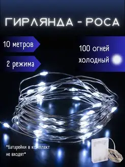 Гирлянда Роса 10 м на батарейках — холодный белый свет