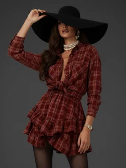 Костюм с юбкой мини в клетку фланелевый трендовый