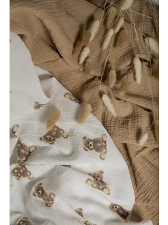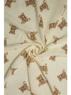 Муслин 2 метра двухслойный жатый мишки на бежевом фоне