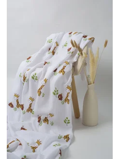 Муслин 2 метра широкий двухслойный жатый жирафы белый фон