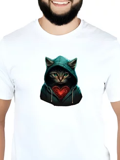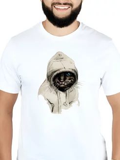 Футболка белая с принтом Кот в капюшоне оверсайз унисекс