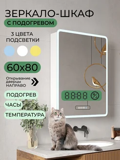 Зеркало-шкаф подсветка 3в1 часами подогревом 60*80 правый