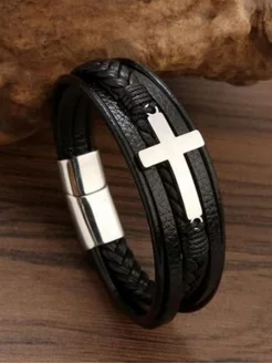 Браслет кожаный плетеный с крестом