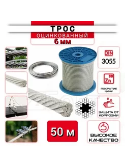 Трос стальной, оцинкованный, 6 мм, 50м, нержавеющий (цинк)