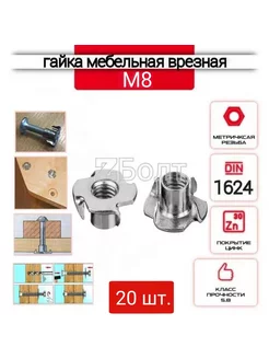 Гайка мебельная, врезная, усовая, оцинкованная М8 -20 шт