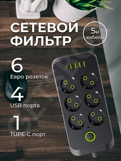 Сетевой фильтр 10 розеток 4 USB и 1 TYPE-C