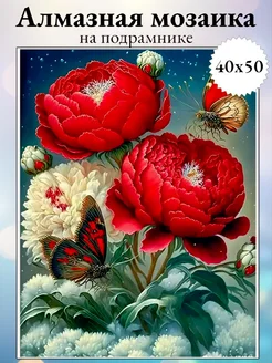 Алмазная мозаика на подрамнике 40х50 Красные пионы и бабочки
