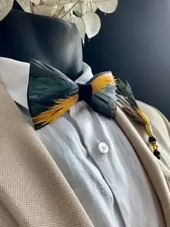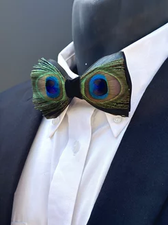 Зеленый галстук-бабочка с натуральными перьями павлина