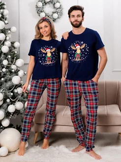 Пижама новогодняя со штанами в клетку и футболкой с принтом