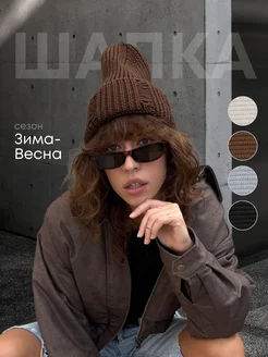 Шапка бини вязаная рваная с отворотом
