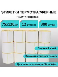 Термотрансферные этикетки 75х120 мм ПГЛ 300 шт, 12 рулонов