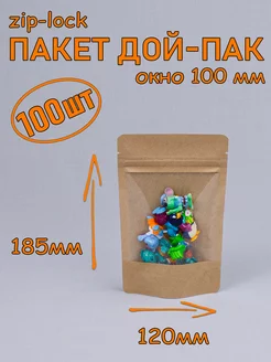 Пакет бумажный Дой-пак 120х185 мм с окном 100 мм, 100 шт
