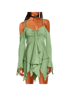 Рваное платье сказочное асимметричное открытые плечи зеленое