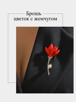 Брошь цветок красный с жемчугом, брошь женская оригинальная