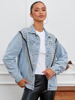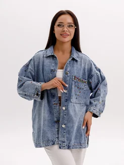 Джинсовка осенняя со стразами рубашка оверсайз