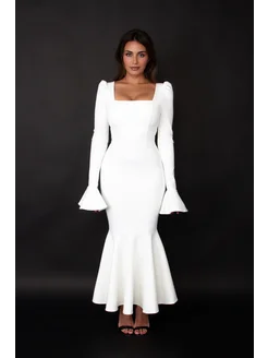 Платье футляр белое вечернее с воланом на роспись