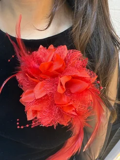 Брошь цветок из ткани с перьями 13см