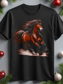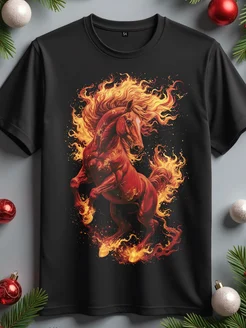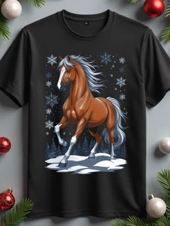 Футболка новогодняя с принтом красной лошади светящаяся