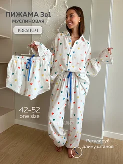 Пижама женская 3 в 1 муслиновая со штанами и шортами